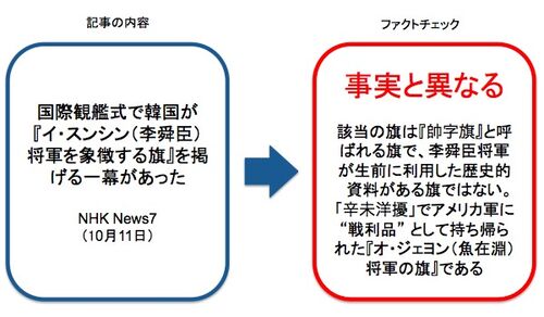 韓国側が『旭日旗』にケチを付けた国際観艦式で、NHK が「イ・スンシン(李舜臣)将軍が使った旗」とする韓国の妄想を事実として放送しています。これは明らかな誤報であり、訂正が必要と言わざるを得ないでしょう。